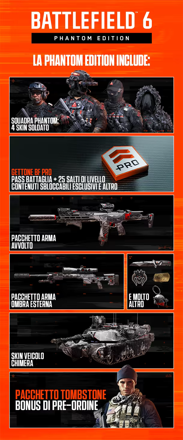 Ricordiamo che Battlefield 6 uscirà ufficialmente il 10 ottobre su PlayStation 5, Xbox Series X/S e PC (via Steam, EA App ed Epic Games Store) in due edizioni: Standard Edition (al prezzo di 69,99€ su PC e 79,99€ su console) e Phantom Edition (al prezzo di 99,99€ su PC e 109,99€ su console). Infine sarà incluso nell’abbonamento EA Play. Chiunque acquisterà il gioco in anticipo riceverà il pacchetto bonus Tombstone.