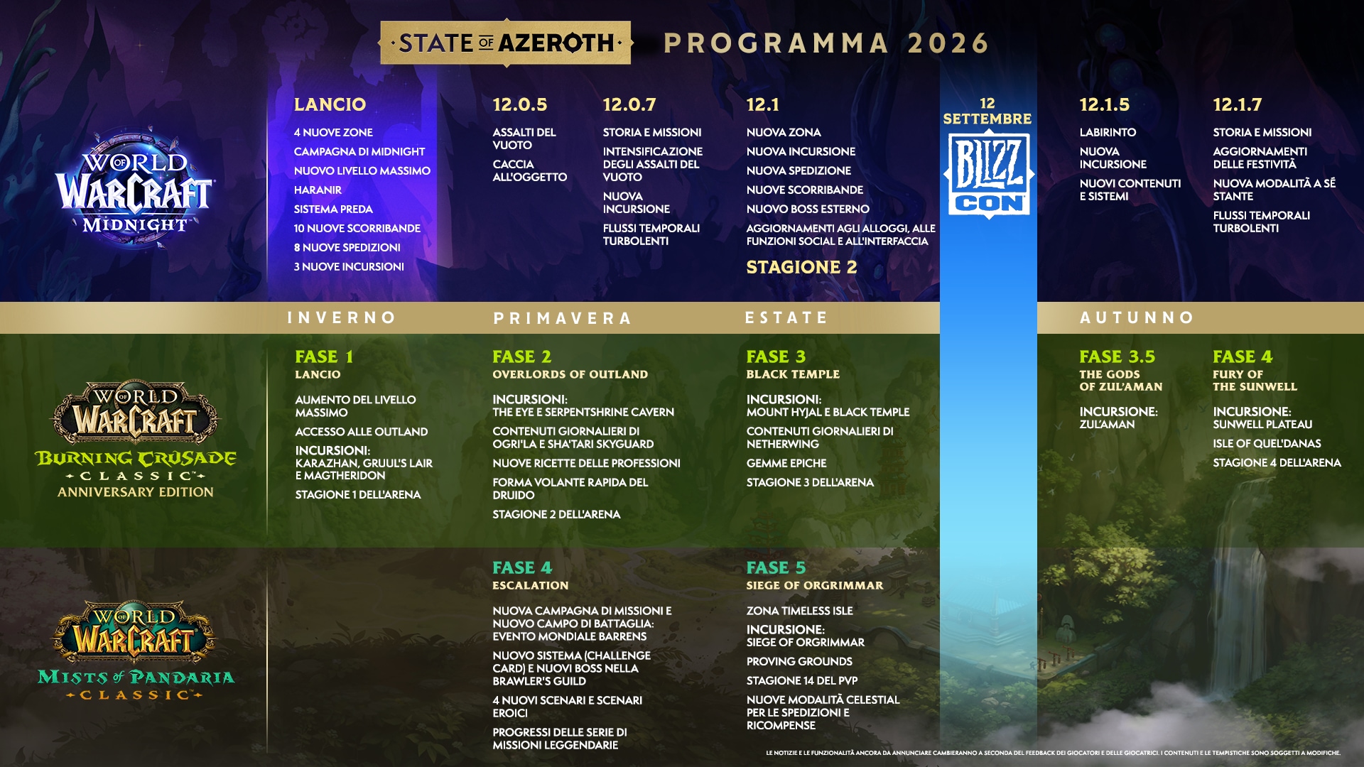 È stata poi pubblicata la roadmap del 2026, che potete vedere poco sotto, dedicata alle varie edizioni di World of Warcraft. Ricordiamo che Midnight uscirà ufficialmente il 3 marzo a mezzanotte. La prossima espansione della Saga dell’Anima del Mondo (Worldsoul Saga) introdurrà quattro nuove zone, un level cap aumentato, il sistema Preda, nuove spedizioni e incursioni. Le patch successive aggiungeranno eventi, missioni, incursioni, zone e tanto altro.